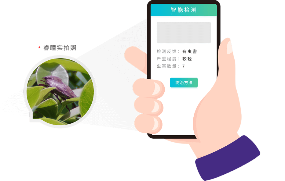 上傳葉片、果實圖像,自動診斷農作物或果樹病蟲害類型,推薦防治方法通過多維度數據建立病蟲害預測模型,智能預警病蟲害的發生